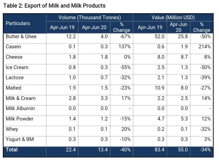 - The major export categories like Butter & Ghee, Lactose and Malted products registered a significant decline in both volume and value terms.